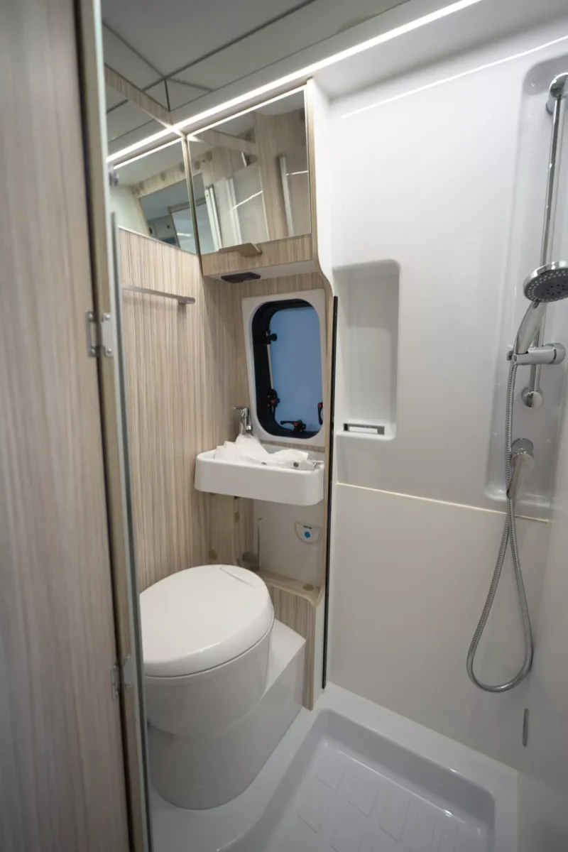 Además, tienes un cuarto de baño con plato de ducha; cocina con nevera y congelador; salón de 4 plazas con asientos de cabina giratorios; televisión, armarios y toldo exterior.