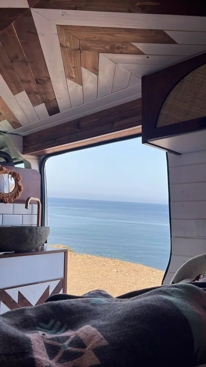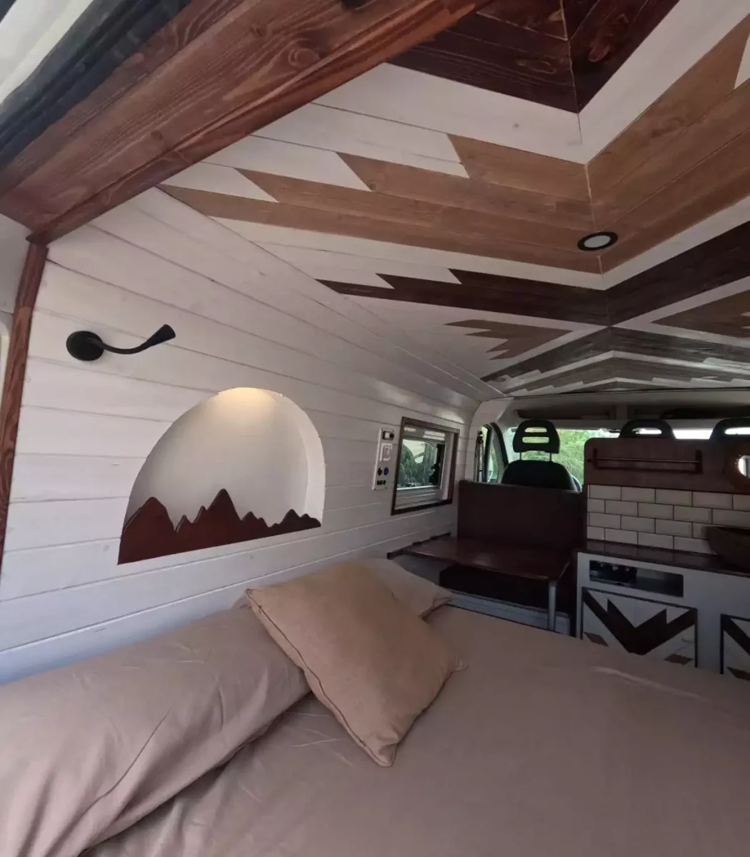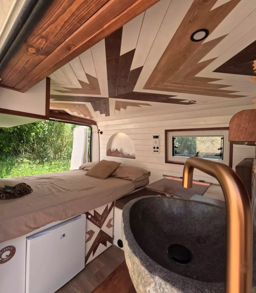 Además, esta furgoneta camper está equipada con un fregadero, set de vajilla, pequeña nevera, cocina portátil, ducha exterior, aire acondicionado en cabina, toldo exterior, mesa y sillas de camping.