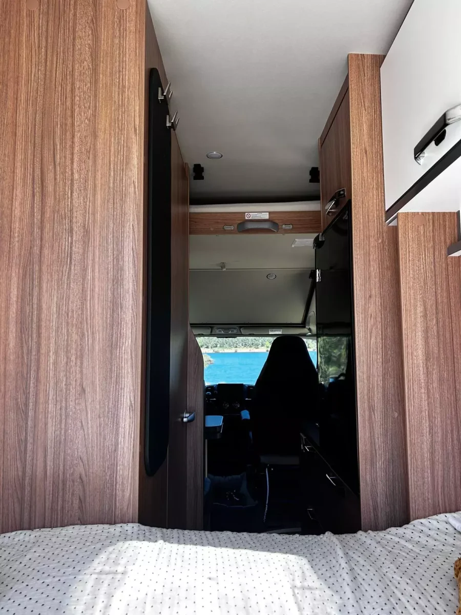 Además, tienes un cuarto de baño con plato de ducha; cocina con nevera y congelador; salón de 4 plazas con asientos de cabina giratorios, armarios y toldo exterior con iluminación led.