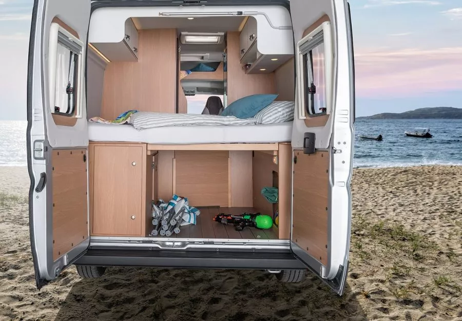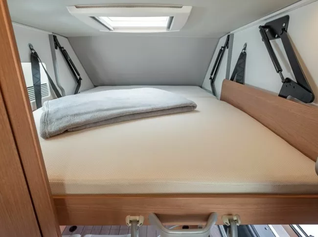 Camper gran volumen con cama trasera elevable manualmente para introducir moto o bicicletas (1,94 x 1,52), cama basculante encima del salón sin invadirlo completamente (1,76 x 1,30), salón convertible en cama individual. Ofrece la posibilidad de dormir hasta 5 personas en menos de 6 metros de longitud.