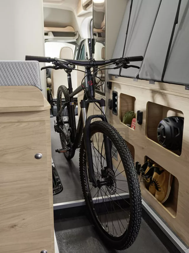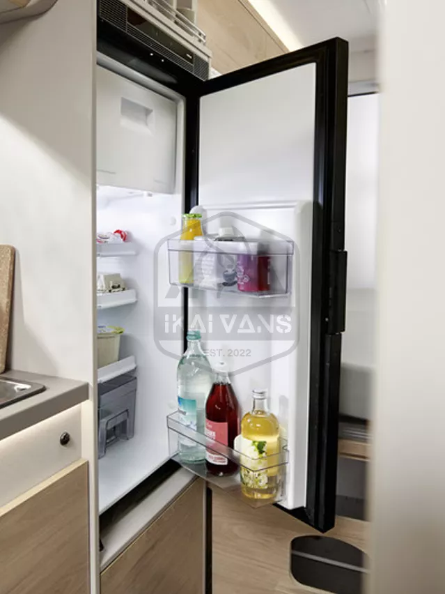 COCINA: El equipamiento completo consta de un fregadero y una cocina de gas con dos quemadores. La cocina cuenta con una tapa de vidrio templado que amplía el espacio de la encimera cuando está cerrada. Para tener mayor almacenamiento, incluye unos cajones para utensilios de cocina y alimentos.