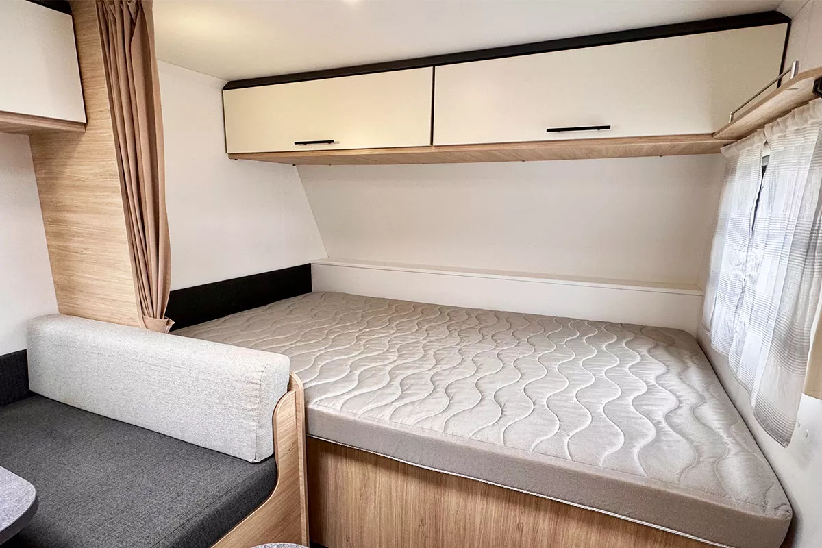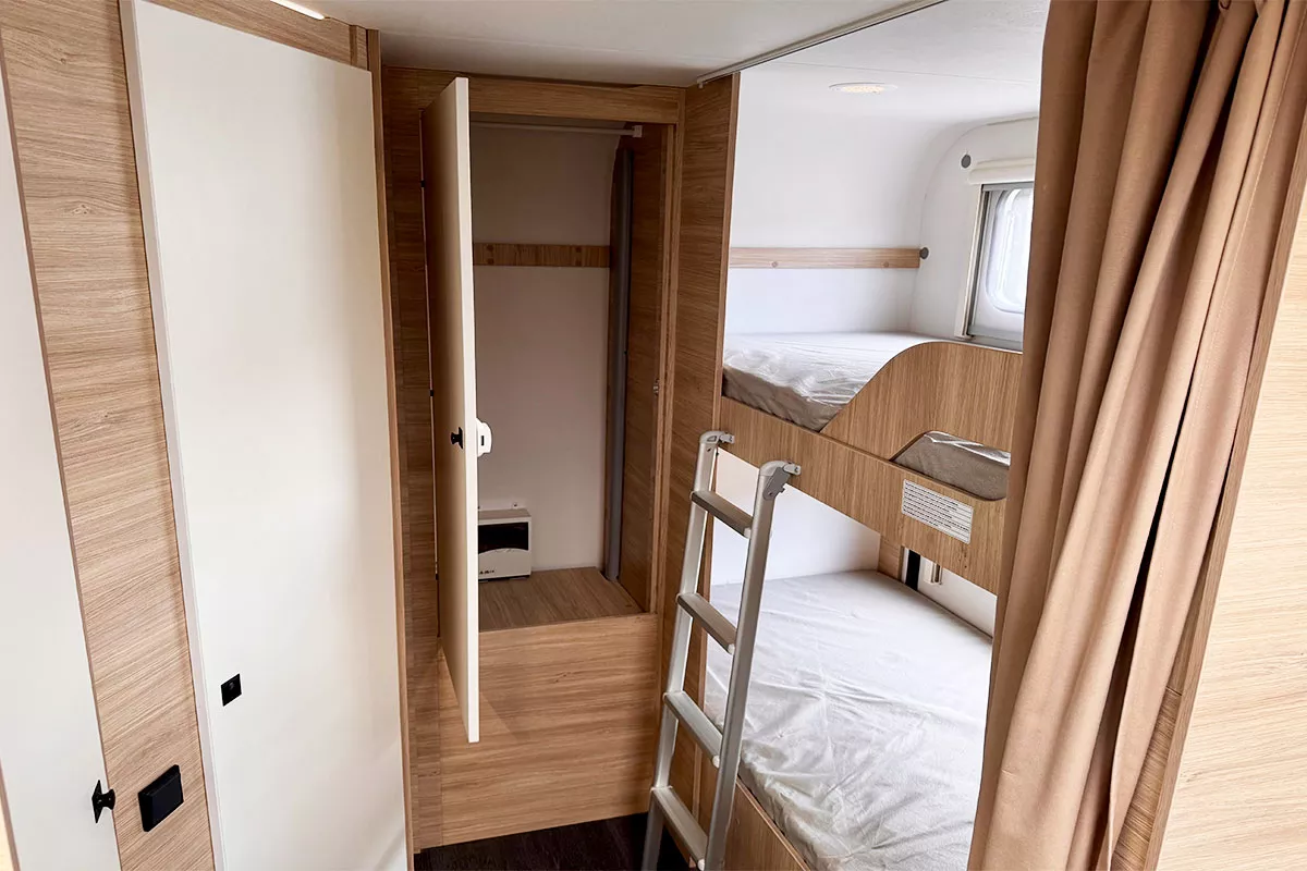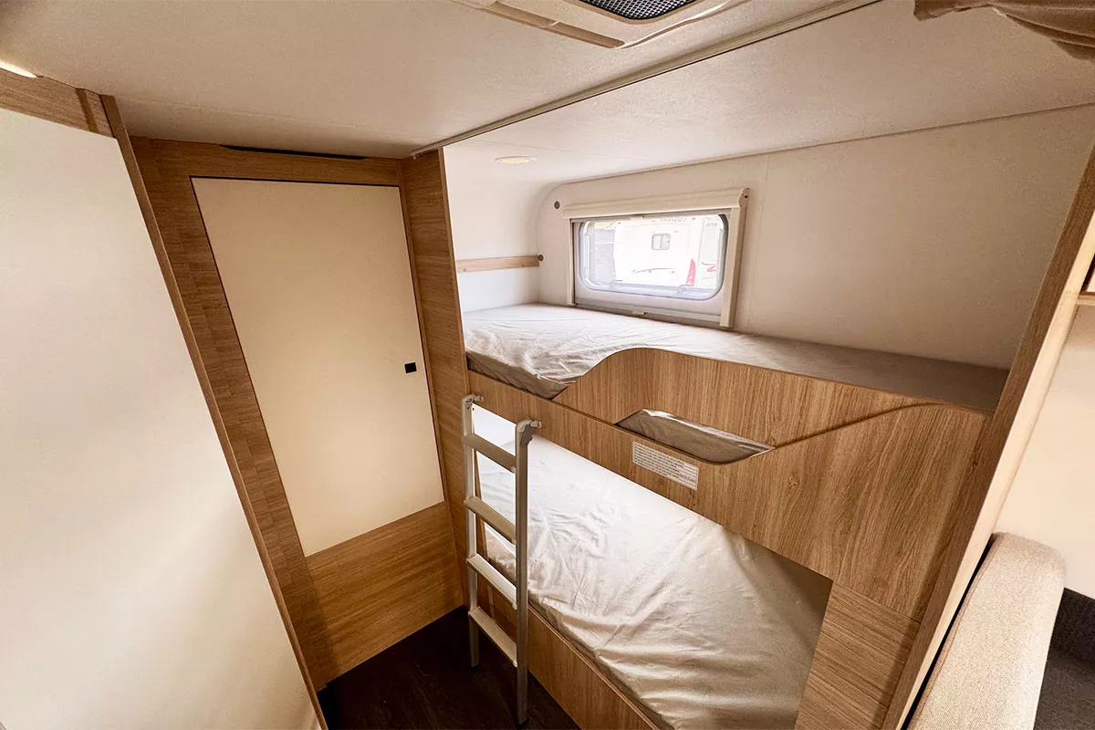 La Caravelair Alba 496 2024 es una caravana familiar ideal para hasta 6 personas, con distribución de 3 ambientes, literas para niños, cama de matrimonio y salón convertible.