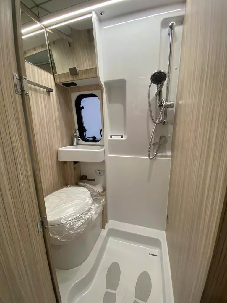 Además, esta furgoneta camper está equipada con cocina de dos fuegos, fregadero, nevera con congelador, menaje completo, cuarto de baño con ducha, agua caliente, calefacción, varios armarios para guardar las cosas, zona del comedor con mesa plegable, televisión y toldo exterior.