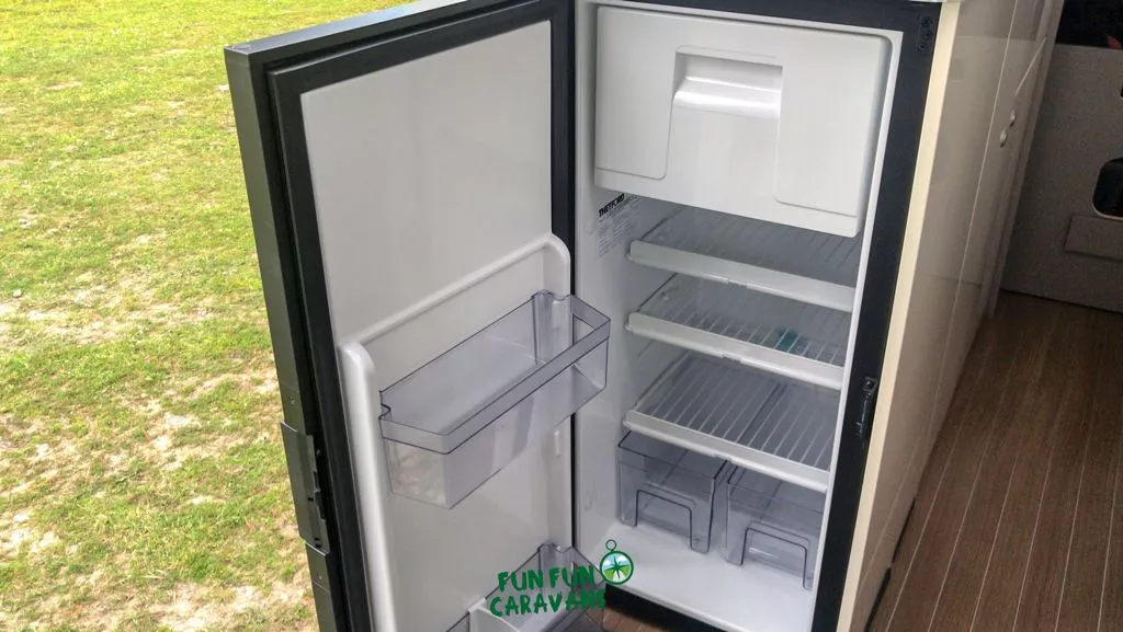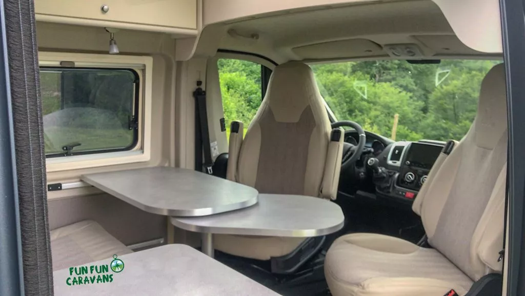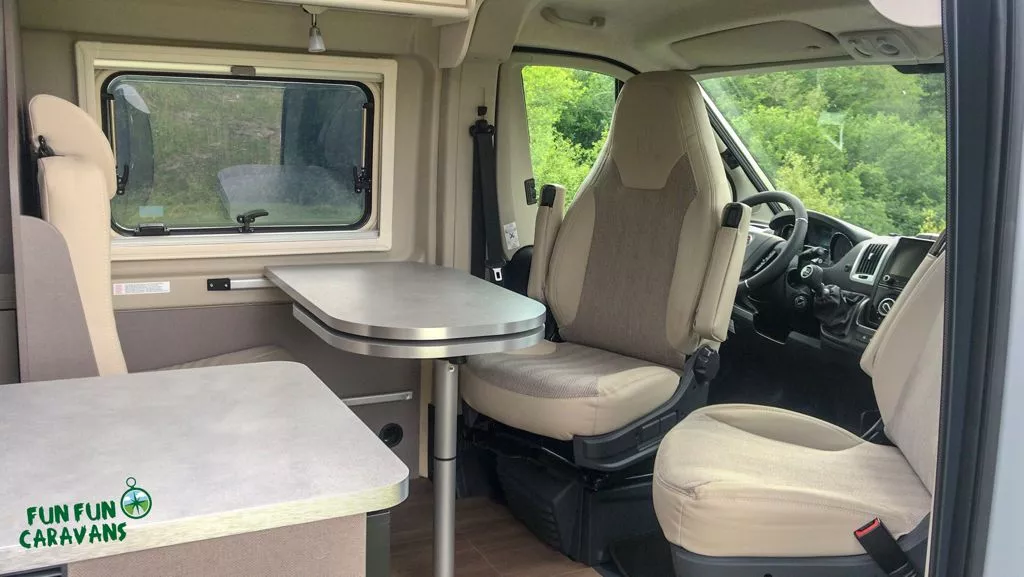 En la parte central tienes un amplio salón con una mesa que se alarga y asientos giratorios del conductor y copiloto. La ducha es independiente del cuarto de baño. Además, tienes cocina de dos fuegos, nevera con congelador y muchos espacios para guardar cosas.