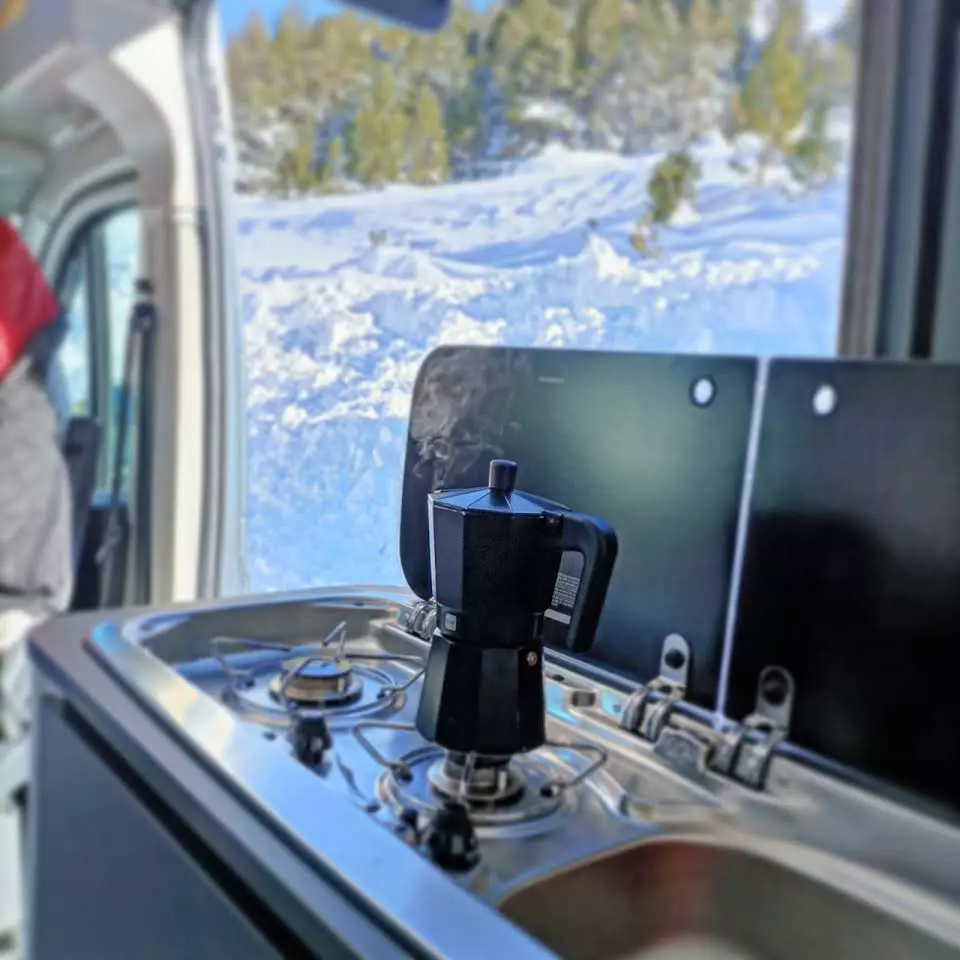 El equipamiento de esta furgoneta camper incluye un cuarto de baño con ducha integrada, cocina completa con nevera, agua caliente, calefacción, zona del comedor con asientos de cabina giratorios, mesa y sillas para exterior y toldo.