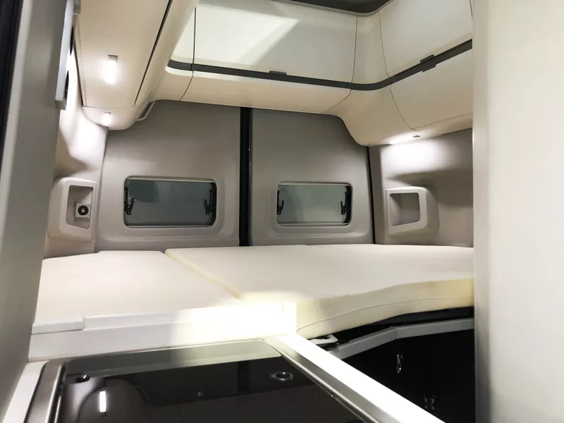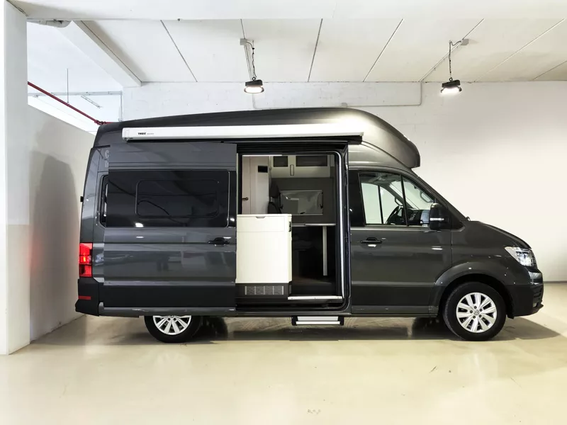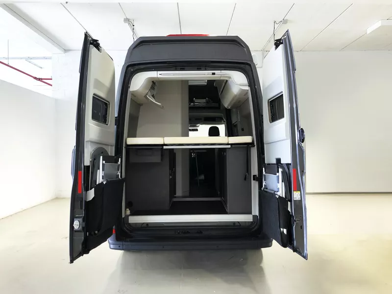 La furgoneta camper Volkswagen Grand California es un vehículo de 6 m de largo que te ofrece hasta 4 plazas para viajar y para dormir. Dispones de dos camas dobles: una transversal trasera y otra en el techo.