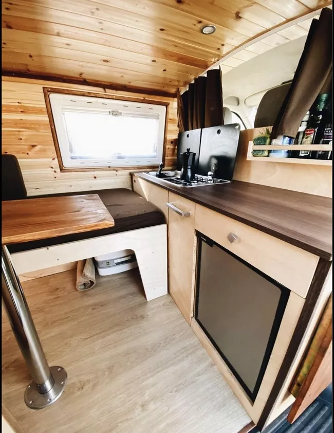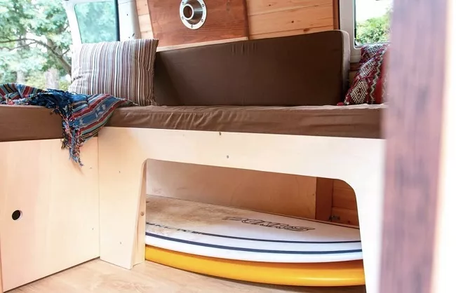 Dispone de un sofá cama doble (1,30×1,85), ventana con mosquitera, mesa central desmontable, mesa exterior extraíble, segunda batería incorporada con tomas a 12V y 220V, pica y grifo con bomba de agua y depósitos, cocina con 2 fogones de gas (con detector de fuga de gas), y frigorífico con congelador marca Dometic, ducha a 12V con depósito, baño químico y diferentes compartimentos de gran capacidad para almacenar (tabla de surf, padel surf, kayaks hinchables, patinetes eléctricos, esquís…).