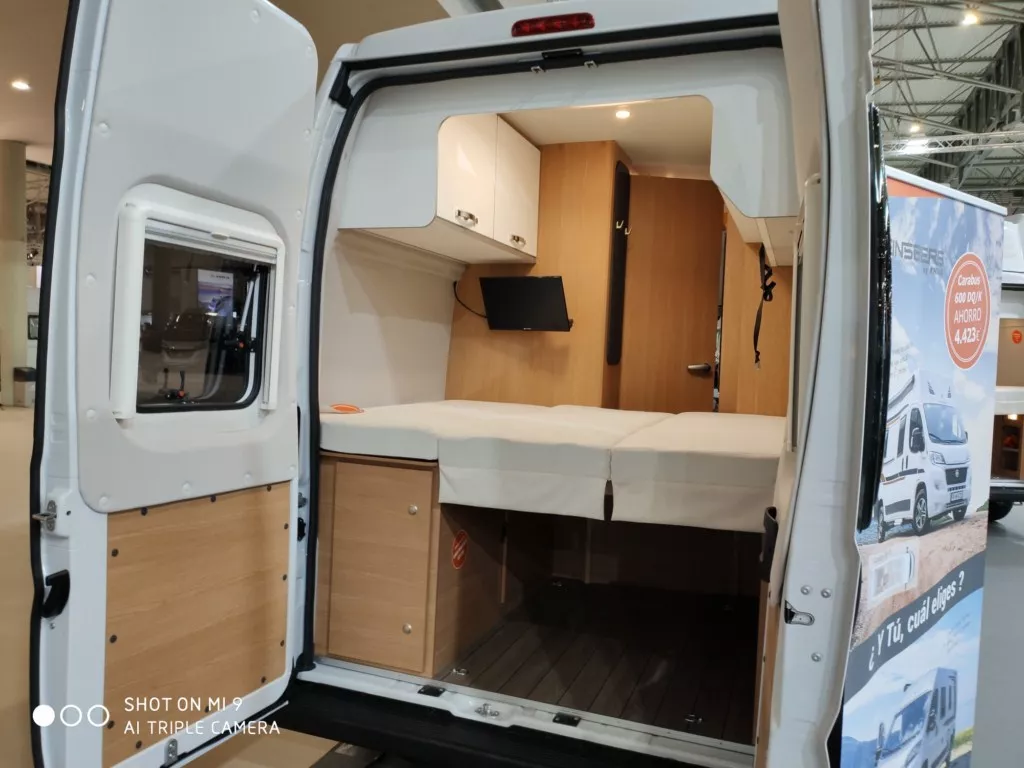 La furgoneta camper Weinsberg Carabus 600 DQ es un vehículo con 5,99 m de largo que te ofrece 4 plazas para viajar y 4 para dormir. Tienes una cama doble transversal de 194×152/140 cm en la parte trasera del habitáculo y otra cama abatible de techo de 176×130 cm en la parte central. Además, tienes cocina de dos fuegos, fregadero, nevera, cuarto de baño con WC, lavabo y ducha, calefacción, TV, mesa del comedor que se amplia y muchos espacios de almacenamiento.
