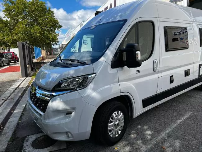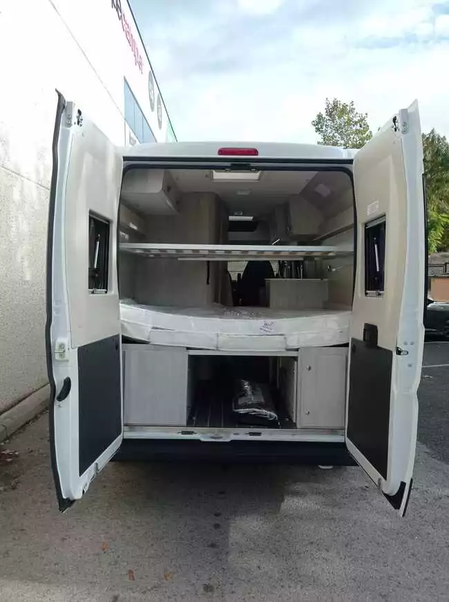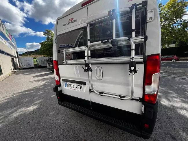 Furgoneta de Ocasión Camper Gran Volumen Roller Team Fiat Ducato de 4 plazas de 5,995 m de largo. Color blanco. Dispone de 2 camas de matrimonio en litera transversales en la parte trasera. Año 2023.