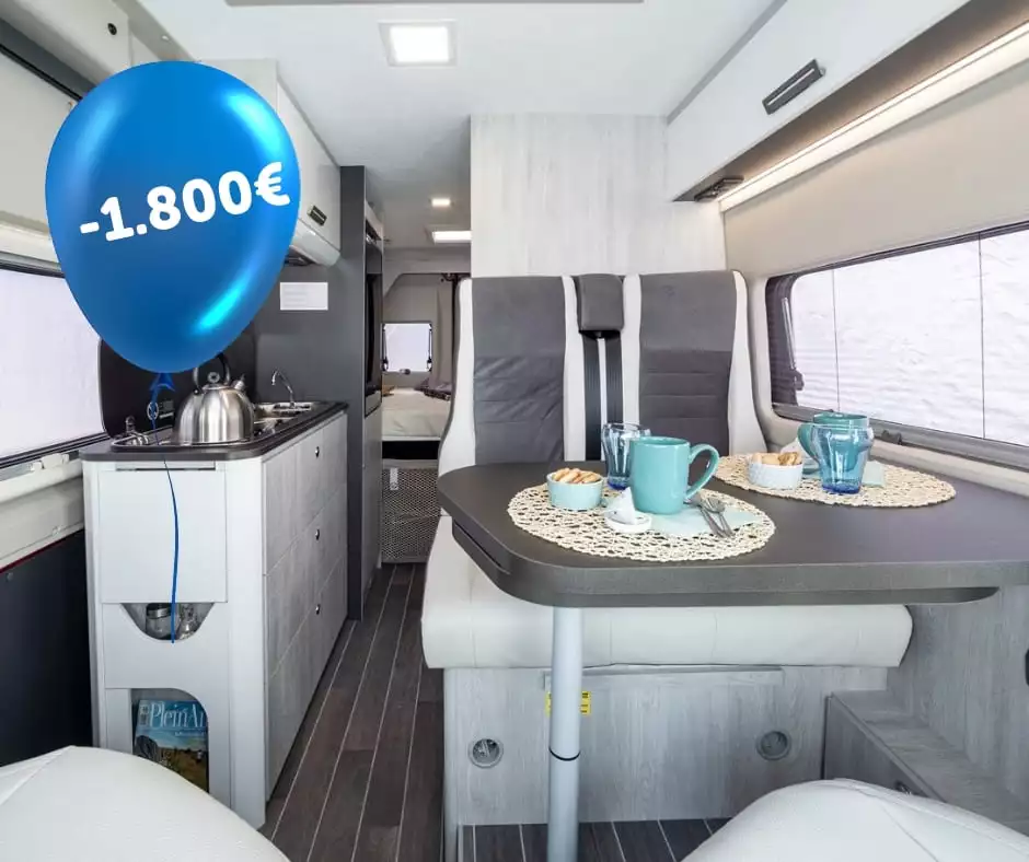 Nuestra Camper Livingstone Sport 2 motor Fiat 140 cv, es perfecta para 2 personas gracias a la distribución que tiene de cama doble trasera, un baño grande, salón con sillones giratorios y una gran cocina ¡Y mucho más!