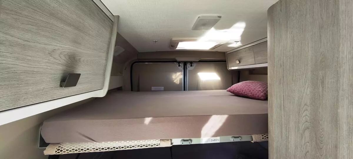 Distribución interior: Comedor, cama doble litera trasera, fregadero, cocina de dos fuegos, lavabo con ducha y váter fijo