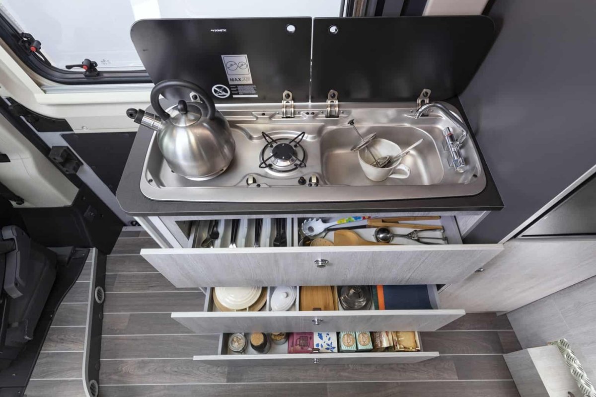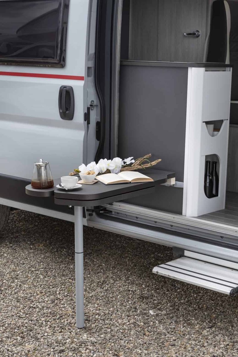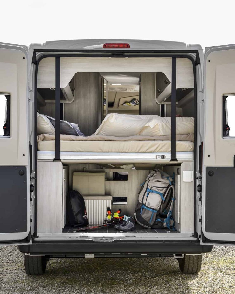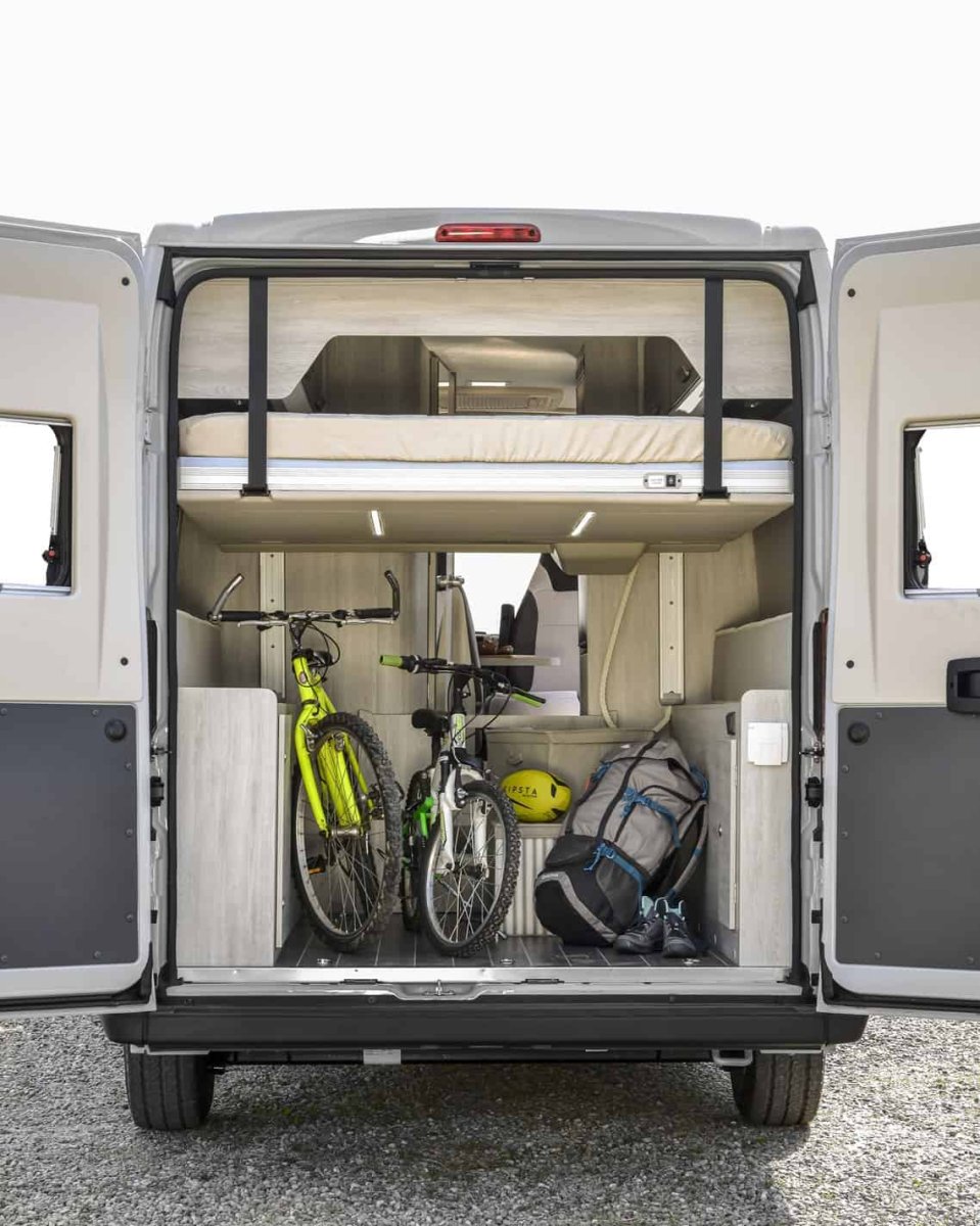La Camper Livingstone Sport Duo XL ¡modelo 2025! es una novedad y una van muy versátil. Su cama abatible eléctrica hace que puedas posicionar según cuánto almacenaje necesites en el maletero. Esto te permite llegar tus bicis en el interior ¡incluso una scooter! Además, cocina completa, baño, espacio de almacenaje y un gran salón.