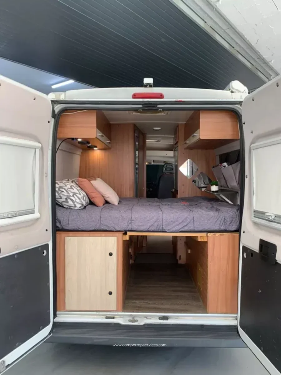 Cama doble trasera + salón convertible (ideal 2–3 personas).