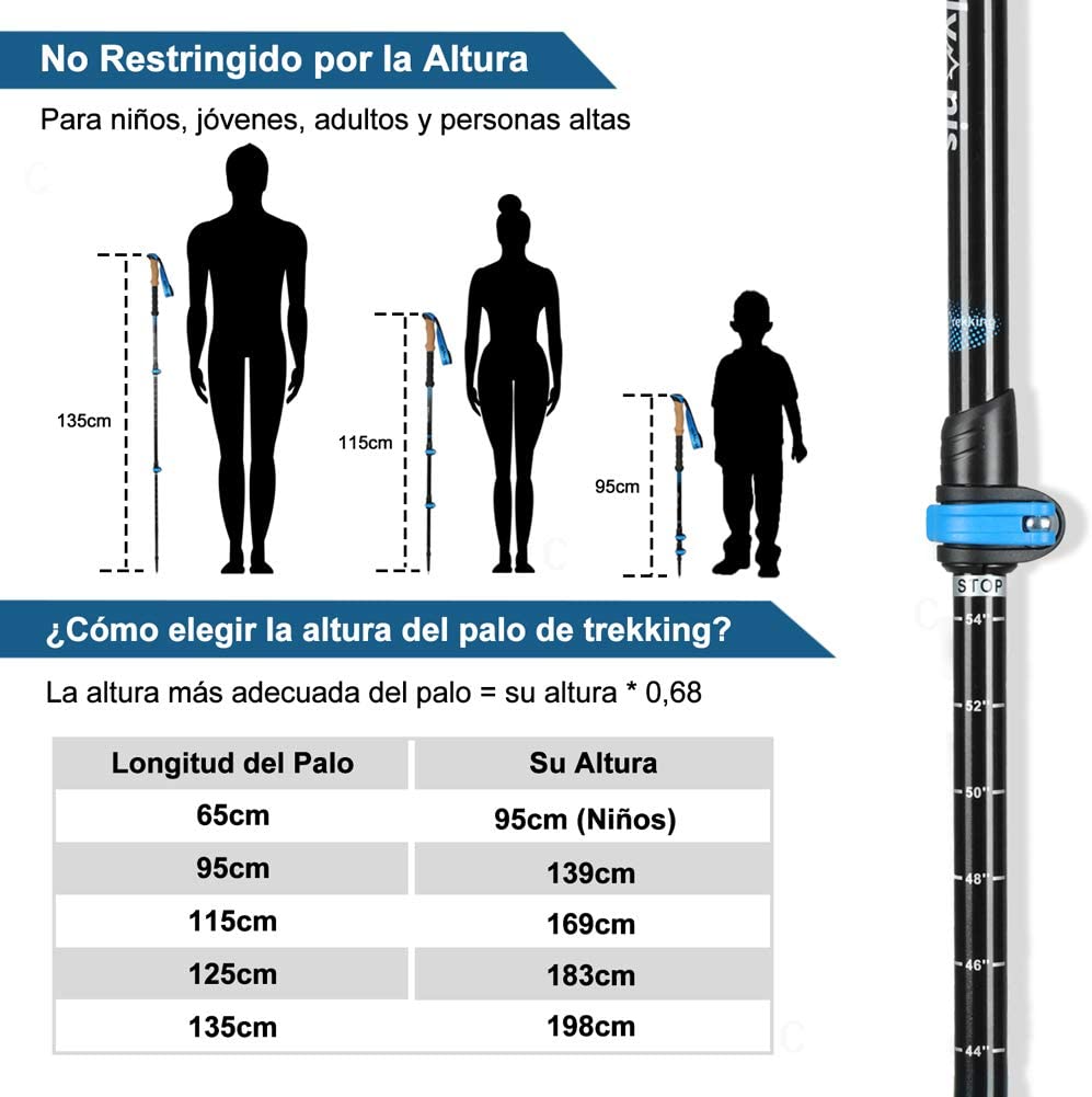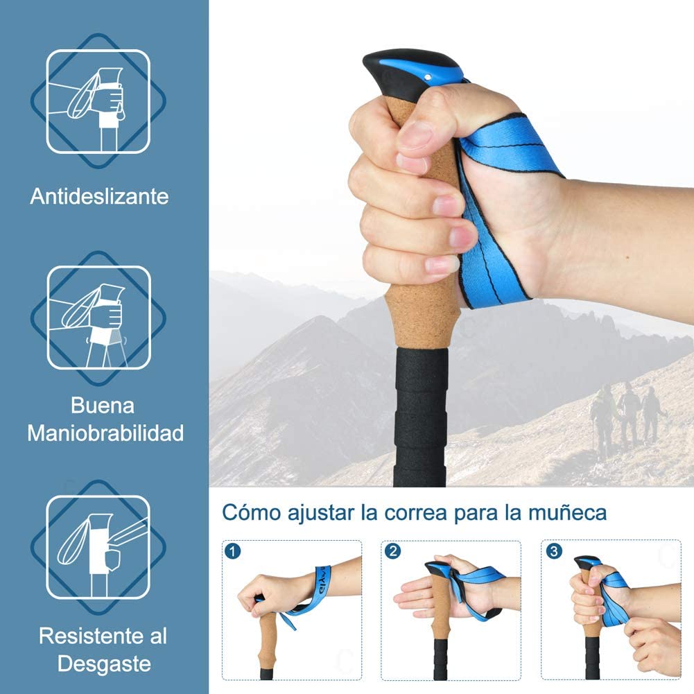 - Mango de Corcho + EVA: Mango de corcho tiene un tacto muy suave para agregar comodidad en sus viajes de senderismo. Absorbe la humedad y el sudor de las manos. Se agrega una mango de EVA debajo del mango de corcho, para que pueda sostener el mango sin ajustar la longitud del bastón al subir y bajar