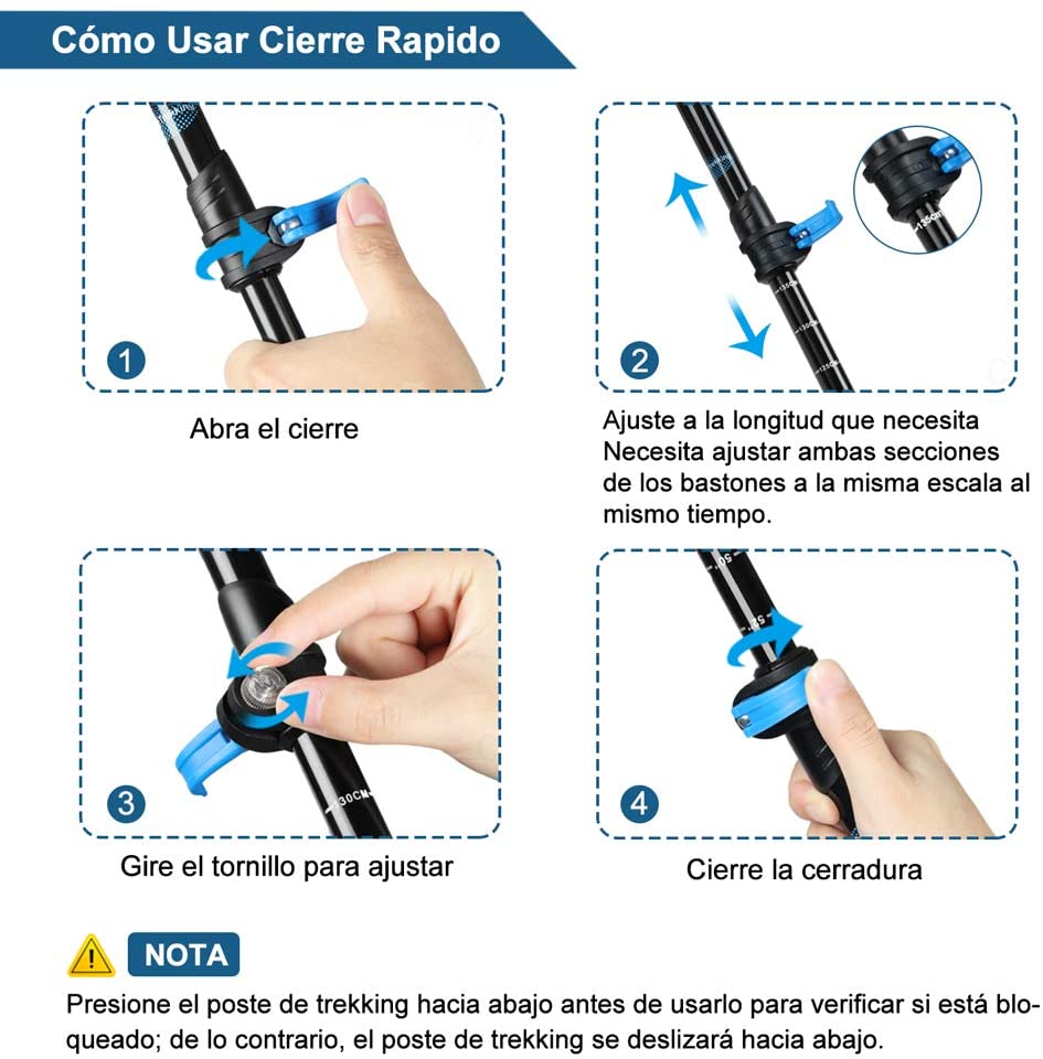 - Ligero y Resistente: Nuestros bastones de senderismo están fabricados en aleación de aluminio 7075 que presenta bastones extrafuertes y ultraligeros para la mayoría de los excursionistas principiantes. Esta materia puede soportar más impacto y presión que la fibra de carbono y el aluminio 6061