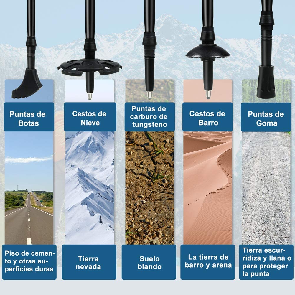 - Accesorios Múltiples: Se incluyen cestos de barro y arena, cestas de nieve, puntas de botas para superficies duras, puntas de goma. Desde caminatas por la ciudad hasta montañas cubiertas de nieve, desde terrenos rocosos hasta caminos rurales fangosos, nuestros bastones de trekking pueden acompañarle en cualquier situación. Además, hay bolsa de almacenamiento y hebillas de conexión, para que pueda llevar bastones durante el viaje.
