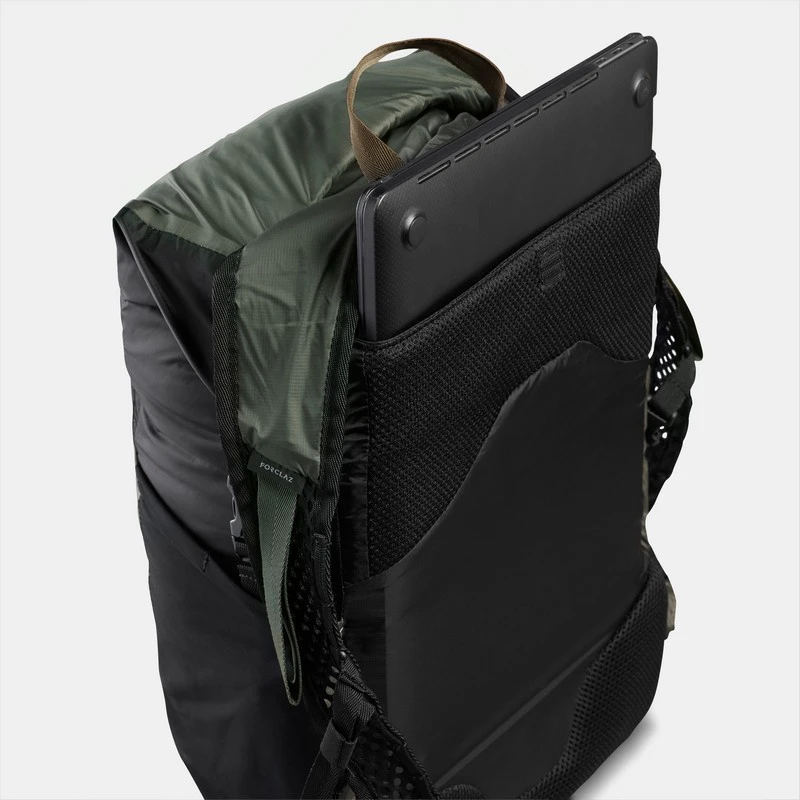 La mochila está concebida con un tejido revestido impermeable 2.000 schmerbers y costuras 100% estancas para evitar la penetración del agua. Tiene un sistema de cierre enrollable similar al de las mochilas de barranquismo. Así, el agua no pasa, como ocurre con un cierre de cremallera. El cierre tipo barranquismo es más eficaz para evitar la penetración del agua en el interior de la mochila.
