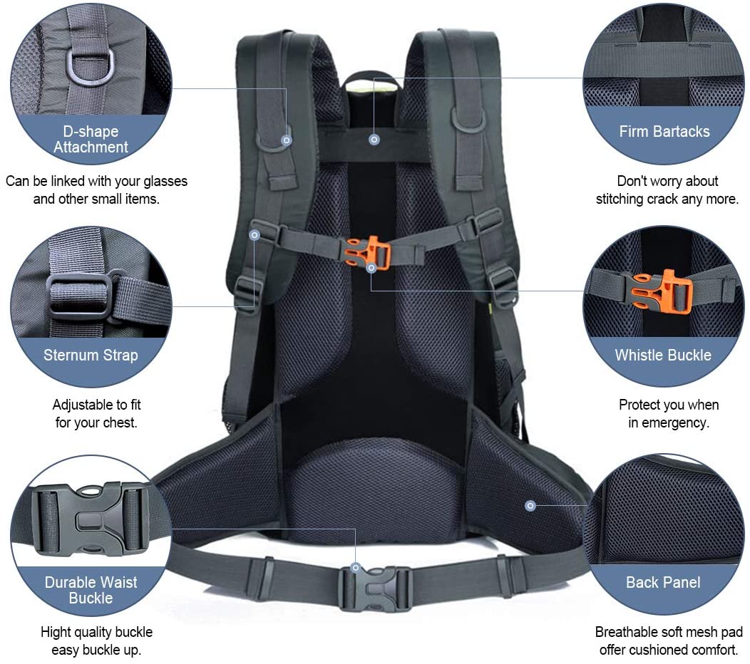 - ❤Diseño Ergonómico Perfecto: El sistema de hebilla cintura de alta carga se coloca bajo grandes cargas y es fácil de apretar. El acolchado de malla grueso transpirable te brinda una caminata cómoda y fácil. Los ajustes independientes de la cadera superior e inferior ofrecen un ajuste más personalizado. Hebilla de silbato emergencia, forma D hebilla y cremalleras de fácil acceso, correas ajustables para hombros y otras correas, bolsillo al cinturón de cadera, bolsillos con cremallera atractivos.