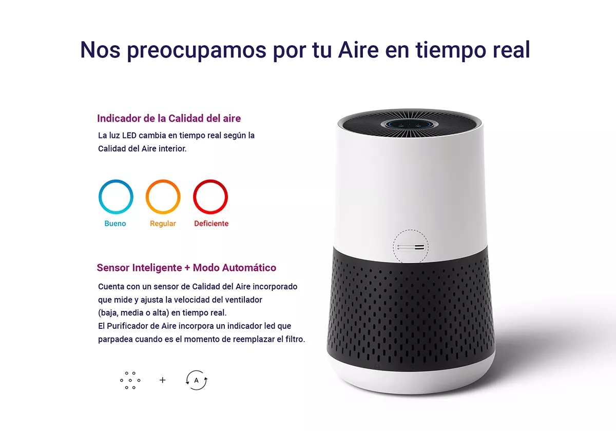 Incluye SENSOR DE PARTÍCULAS que muestra la calidad del aire interior a través de un sistema de luces led.