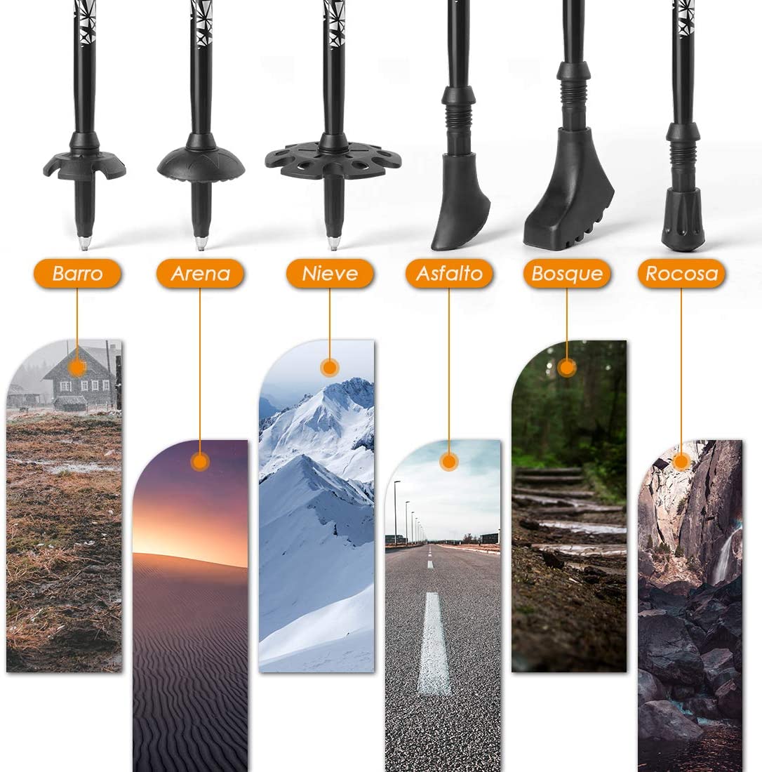 - ⛺【Aplicable a la mayoría de los terrenos】: la punta está hecha de acero de tungsteno y es especialmente adecuada para la mayoría de los terrenos. La robusta punta de goma suprime el ruido en pisos duros y evita el desgaste de la punta de metal. Varias tablas son adecuadas para arena, barro y nieve para evitar que los bastones de trekking caigan en la nieve o caigan en las grietas.